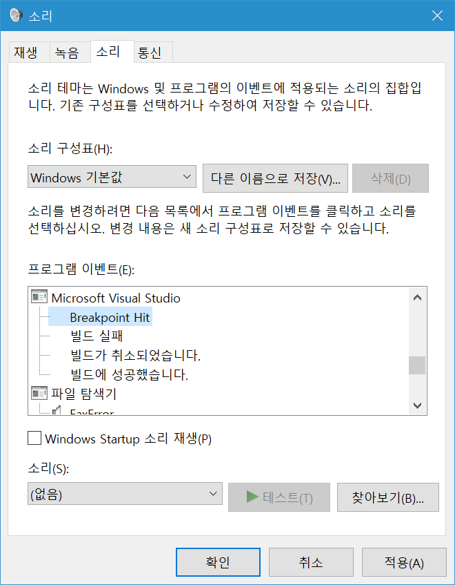 소리 설정에 가면 프로그램 이벤트에서 Visual Studio 관련 이벤트에 원하는 소리를 할당하면 된다.