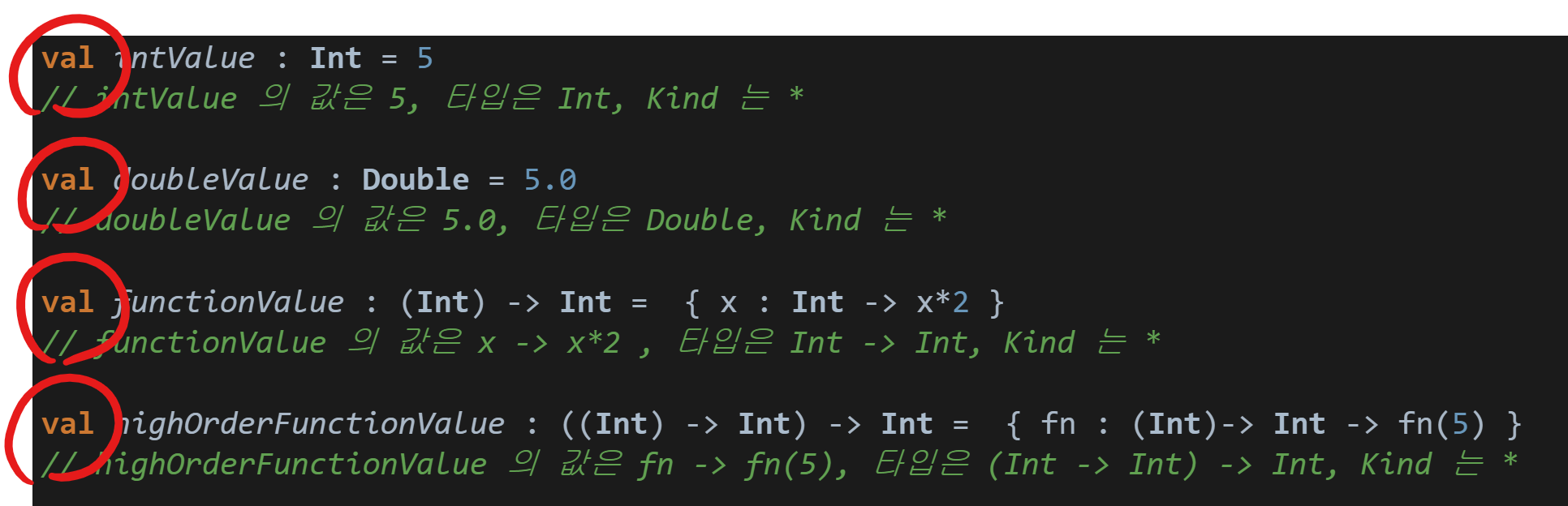 - Order 0 : Int 나 Double 같은 타입. Order 0 타입(Type) 의 값은 5 또는 5.0 과 같다.
