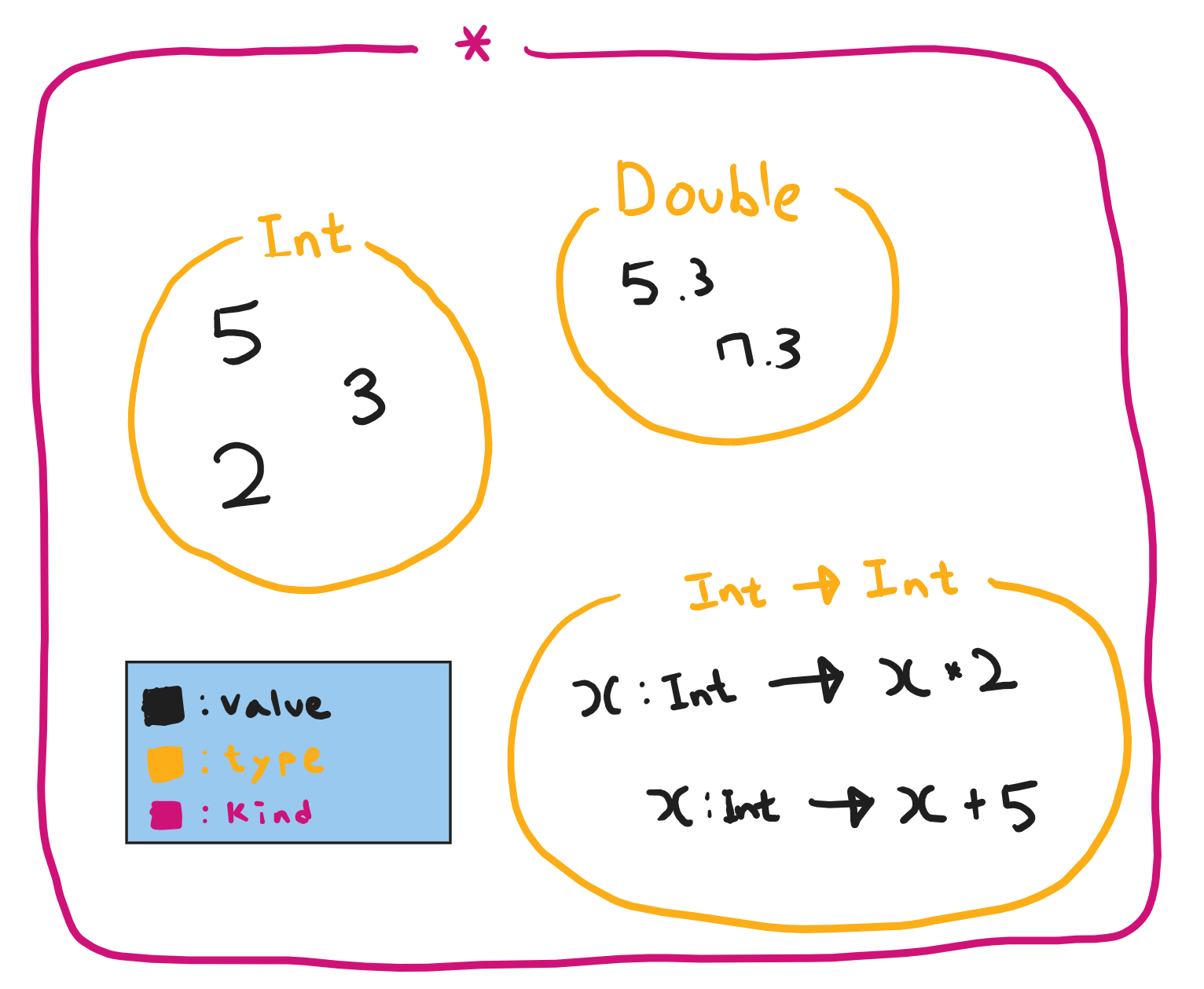 *, pronounced "type", is the kind of all data types seen as nullary type constructors, and also called proper types in this context. This normally includes function types in functional programming languages. - 위키피디아