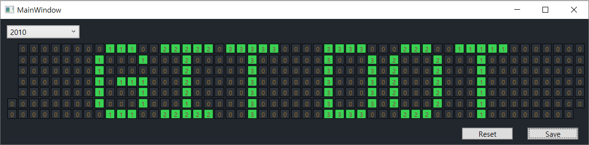 - gitdot-visual : WPF 로 뚝딱 만든 비주얼 툴로, 마우스로 원하는 Cell 에 얼만큼 커밋할지를 지정할수있는 SW, Save 하면 그 기록을 File로 떨구고 이를 gitdot-cli가 실제 커밋한다.