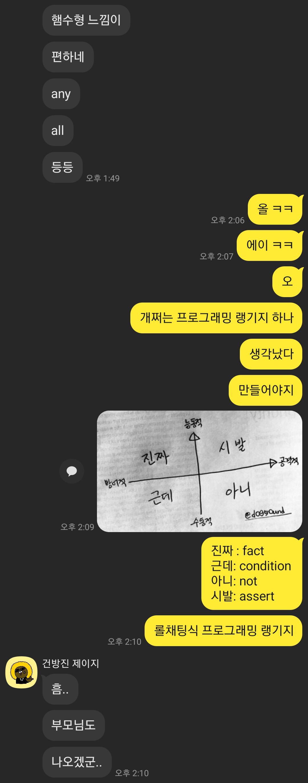 지인이 말한 all 함수 편하다 -> 올 ㅋㅋ -> 함수명이 올 ㅋㅋ 으로 지어도될듯 -> 진짜/시발/근데/아니 짤 -> 이거 롤 채팅 아니냐? 라는 기적의 야크털 깎기식 논법으로 프로그래밍 언어를 하나 만들어보자는 생각이 들었고