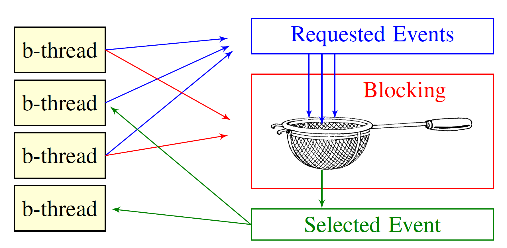 - 모든 BThread 가 sync 상태면, 받은 요구사항을 분석한다