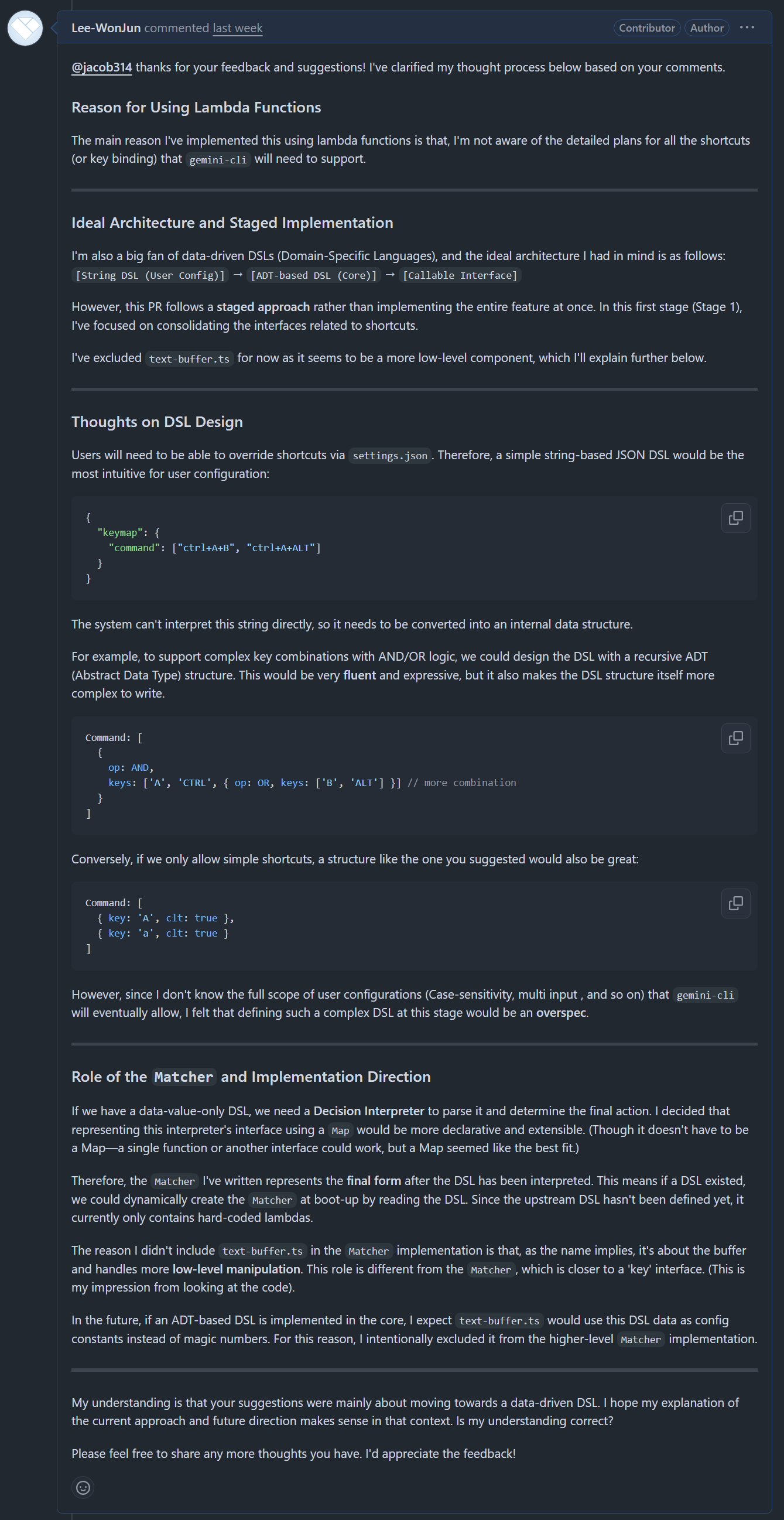 처음에 내가 해당 Matcher 만 구현한것은, 내가 원하던 구조에서 키 바인딩 중앙화에 관한것이고, 리뷰처럼 Data Driven 한 DSL 의 필요성을 알고 있으나, 이는 사용자의 Key Binding 커스터마이징을 어떻게, 어디까지 허용할지, 그리고 단축키에 대한 미래 계획 (멀티 Key Binding 등) 을 내가 알수없고,